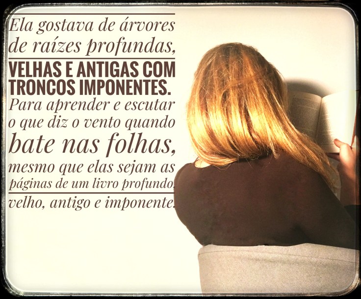 Eng: She liked trees with deep roots, old and ancient with imposing trunks. To learn and listen to what the wind says when it touches the leaves, even if they are the pages of a deep, old, ancient and imposing book.